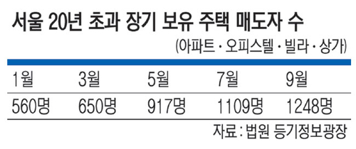 20년 초과 보유주택 매도자 수는 지난 1월 560명에서 6월 1108명으로 상반기에만 2배 가까이로 늘었다. 이후 6·27 대출규제 이후 시장 관망세 속에서도 8월까지 2개월 연속 1100명대를 기록하며 신기록을 쓰더니 지난달 1200명대를 처음으로 돌파했다. 2018년 3월 1124명 이후 7년 6개월 만에 가장 많았다.