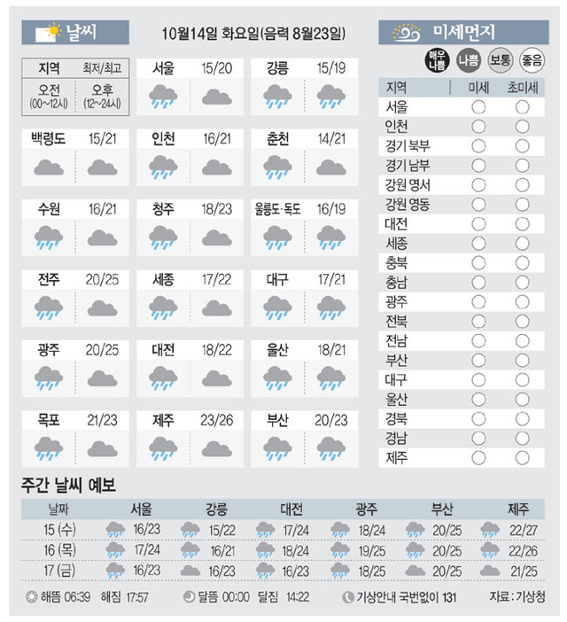 [날씨이야기]10월14일 화요일(음력 8월23일)
