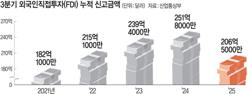 산업부 관계자는 “상반기 국내 정치 상황과 미국발 통상정책 불확실성 지속, 환율 상승 등 영향으로 3분기(누적) 신고 실적이 감소했다”고 분석하며 “외국인 투자 유치를 위해 현금, 입지지원 등을 통해 국내외 잠재적 투자기업 발굴·유치를 지속할 계획”이라고 말했다. 1∼9월 평균 환율은 지난해 1달러당 1353원에서 2025년 1413원으로 4.4%가량 상승했다.