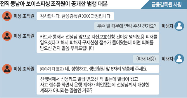 A 씨가 속했던 범죄조직은 △중국의 해킹팀 △한국의 수금책 및 통신팀 △동남아시아 텔레마케팅(TM)팀으로 나뉘어 활동했다. 그에 따르면, 해킹팀이 한국인의 개인정보를 해킹하면 이를 TM팀에 넘긴다. 이후 TM팀이 개인정보를 이용해 보이스피싱을 시도하고, 한국에 있는 수금책이 중국으로 수익금을 송금하는 구조로 운영됐다. A 씨가 일했던 베트남 소재 TM팀은 한국 영업시간에 맞춰 일했다. 조직원들에게는 역할(검찰·금융기관·택배업체 직원)에 따라 A4용지 14∼15쪽 분량의 대본집이 주어졌다. A 씨는 “상가 건물 한 사무실에서 관리자 5∼6명이 조직원 20명을 관리했다”며 “식사도 배달만 허용하고 외출도 제한된 채 하루종일 전화만 했다”고 말했다.