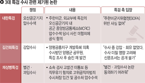 더불어민주당이 밀어붙인 특검법 개정으로 내란·김건희·채상병특검 등 3대 특검의 수사기간이 연장된 가운데 과잉수사, 별건수사 논란이 커지고 있다. 지난 7월 내란특검(특별검사 조은석)의 경기 평택시 오산공군기지 압수수색에 대해 주한미군이 공식 항의하는 등 수사 관련 잡음이 끊이지 않고 있다.
