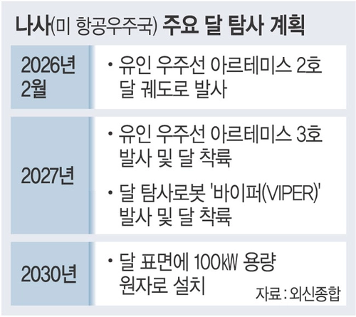 또 나사는 중국의 달 원전 건설 계획에 맞서 당초 계획됐던 2035년보다 5년 앞당긴 2030년까지 달에서 최소 100㎾ 용량의 원자로를 설치한다는 목표를 제시했다. 해당 용량은 약 80가구에 전력을 공급할 수 있는 규모다. 해당 계획을 공개한 숀 더피 미 교통부 장관 겸 나사 국장대행은 “미래의 달 경제를 지원하는 한편 화성에서 에너지를 생산하고, 우주에서 국가 안보를 강화할 수 있는 이 중요한 기술을 제대로 발전시키려면 나사가 신속하게 움직이는 것이 필수적”이라고 강조했다. 나사는 앞으로 두 달 안에 관련 기업들의 의견을 수렴할 계획이다.