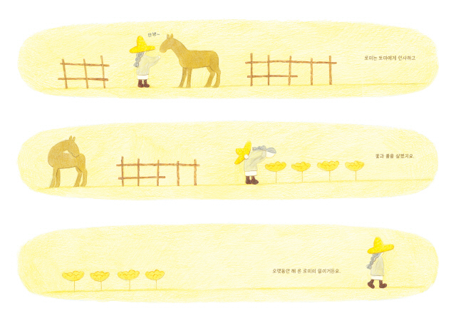 잠시 쉬어 가는 때도 있다. 기대어 앉아 무성한 나무들을 바라본다. 그러다 가지만 남은 앙상한 나무에게 옷을 입힌다. 그럴 수 있다면 로미는 보이지 않는 외로운 마음까지 포근히 안아 주고 싶다. 부드러운 갈색 털을 가진 말 토마는 그런 로미의 여정을 내내 함께한다. 여행의 끝에 이른 로미는 토마를 끌어안는다. “안녕, 나의 토마. 내 곁을 지켜 줘서 고마워.”