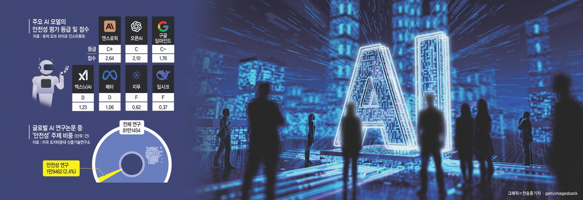 3일 미국 비영리 연구기관 퓨처 오브 라이프 인스티튜트가 오픈AI·구글 딥마인드·앤스로픽·엑스(x)AI·메타·지푸·딥시크 등 AI 모델을 가진 7개 기업을 대상으로 안전성을 분석한 결과, 평균 평점은 학점 기준 낙제에 가까운 ‘D’로 나타났다.