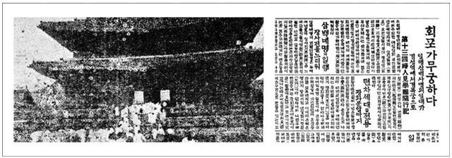 일행들은 전차를 타고 광화문 앞에 다다라 곧 제자리를 떠나게 될 궁궐의 문과 마주했다. “광화문! 아, 얼마나 우리의 귀에 익숙한 이름이냐. 춘풍추우(春風秋雨) 수백 성상(星霜)에 갖은 환란과 온갖 풍파를 모조리 겪고 이제 마지막 운명까지 당하게 된 옛 궁궐의 정문이다. 전차에서 내린 우리 단원 중에는 감회 깊은 어조로 ‘이 문이 헐린대요?’ 하고 묻는 이도 있고 ‘나는 마지막 작별로 왔어요’ 하며, 손수건으로 눈물을 씻는 이도 있었다. 삼천리강산에 주인이 바뀐 오늘날 부질없는 이야기를 더 할 필요가 있으랴마는 머지 아니하여 이 문은 우리와 작별하고 근정전 동편으로 쫓겨 가서 저 눈물겨운 귀양살이할 신세를 생각하니, 누구나 감개무량한 옛 회포가 일어나지 못할 줄 안다.”