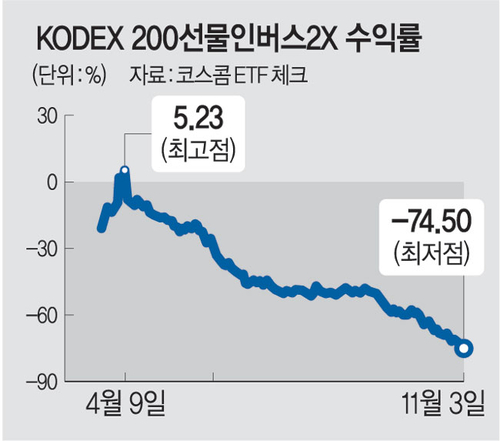 코스피가 사상 최초로 4200선을 돌파하는 등 고공행진 하는 가운데 코스피200선물지수 일일 상승률을 역으로 2배 추종하는 KODEX 200선물인버스2X 상장지수펀드(ETF)의 수익률이 올해 들어 -70%를 넘어선 것으로 나타났다. 증시 하락에 과감하게 베팅했던 투자자들의 시름도 깊어지고 있다.