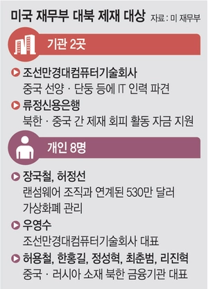 허용철, 한홍길, 정성혁, 최춘범, 리진혁 등은 중국 또는 러시아에 기반을 둔 북한 금융기관 대표자들로, 미국 제재 대상인 북한 금융기관을 대신해 자금 송금 등에 관여한 것으로 파악돼 제재 대상에 올랐다. 또 제재 대상이 된 북한 소재 금융기관인 류정신용은행은 중국과 북한 간의 제재 회피 활동을 위한 금융 지원 활동을 해왔다고 재무부는 설명했다.