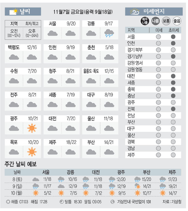 [날씨이야기]11월7일 금요일(음력 9월18일)