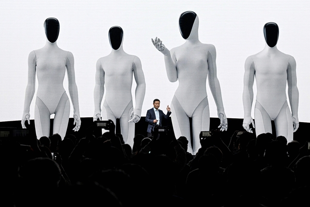 중국 전기차업체 샤오펑의 창립자 허샤오펑 CEO가 중국 광둥성 광저우 본사에서 열린 인공지능데이 콘퍼런스에서 휴머노이드로봇을 공개하고 있다.