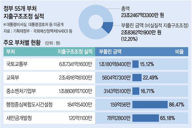 부처별로 보면 문제는 더 심각하다. 교육부는 구조조정 실적 2조4916억 원 중 5604억 원(22.49%)이 종료 예정 사업 또는 사업명 변경이었다. 행정중심복합도시건설청은 구조조정 184억 원 중 159억 원(86.47%), 새만금개발청은 120억 원 중 78억 원(65.18%) 등이 지적 사항에 올랐다. 그동안 정부는 지난 정부보다 3조~4조 원 크게 구조조정을 단행했다고 설명해 왔다. 윤석열 정부 시절 예산안의 구조조정 규모는 2023년 24조1000억 원, 2024년 22조7000억 원, 2025년 23조9000억 원이었다. 부풀려진 항목을 제외하면 이번 구조조정 규모가 기존 예산안들과 큰 차이가 없다는 지적이다.