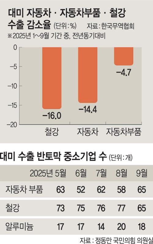 한국무역협회에 따르면 자동차와 자동차부품, 철강 등의 올해 1~9월 대미 수출 규모는 전년 같은 기간 대비 각각 14.4%, 4.7%, 16.0%가 줄었다.
