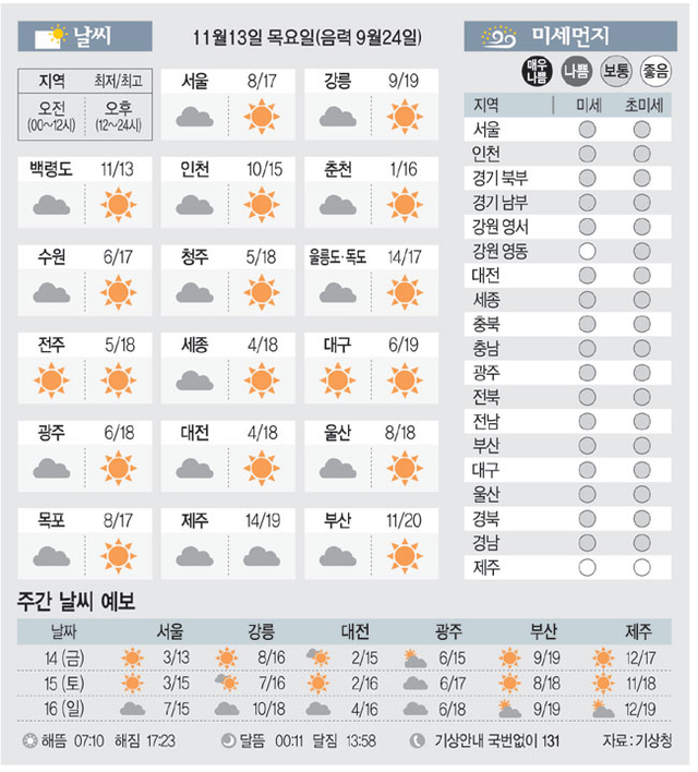 [날씨이야기]11월13일 목요일(음력 9월24일)