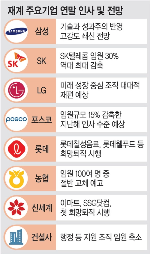 내년에도 올해처럼 경제 전반에 불확실성이 예상되면서 재계에서 비용 효율 극대화를 위한 ‘극단적 긴축’과 인공지능(AI)·미래 기술 중심의 ‘세대교체’ 인사가 가속화할 것으로 분석된다.