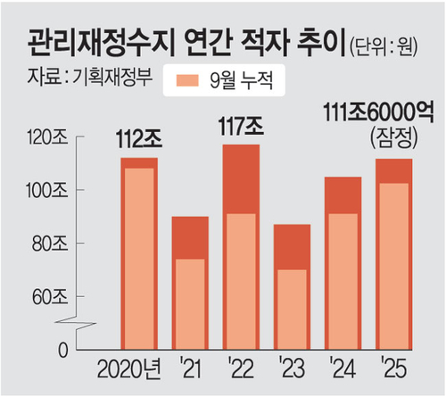 1~9월 나라살림(관리재정수지) 적자 규모가 102조4000억 원에 달한 것으로 나타났다. 코로나19로 대규모 재정이 집행됐던 2020년 이후 역대 두 번째로 많은 수준이다. 국가 재정 건전성에 적신호가 켜졌지만 정부는 확장 재정 기조를, 국회는 내년 6·3 지방선거를 앞두고 ‘농어촌 기본소득’ 등 선심성 예산까지 확대하고 있어 재정 부담이 가중될 것이란 우려가 커지고 있다.