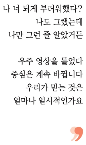 그날 밤 슬기는 이상하리만치 잠이 오지 않아서 한참을 뒤척이다가 유튜브에서 우주 영상을 보았다. 광활한 우주를 가로지르는 태양을 작은 나선처럼 움직이며 따라가는 지구가 있었다. 내레이터가 말했다. 우리는 태양을 중심으로 지구가 돈다고 배웠습니다. 하지만 사실은 태양도 은하 중심을 공전하죠. 그리고 우리 은하는 라니아케아 초은하단의 중력 구심점을 향해 이끌려갑니다. 기준을 어디 두는지에 따라 중심은 계속해서 바뀝니다. 우리가 중심이라고 믿는 것은 얼마나 일시적인 것인가요?