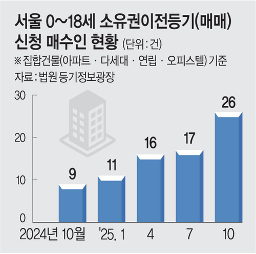 17일 법원 등기정보광장에 따르면 지난달 0∼18세 미성년자가 서울에서 집합건물(아파트·다세대·연립·오피스텔)을 매수하고 소유권 이전 등기를 마친 건수는 총 26건으로 집계됐다. 이는 2022년 8월 이후 최고치다.