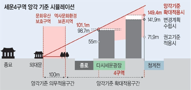 서울시에 따르면 세운4구역은 종묘의 정남향에서 44도 우측으로, 형태를 지각하는 시야각도 30도 범위의 밖에 있다. 게다가 서울시는 의무사항이 아닌데도 역사문화환경보존지역에 해당하는 앙각(仰角) 기준(27도)을 적용했고, 이 기준으로도 149.4m까지 가능한 청계천변 건물 높이를 오히려 145m로 낮췄다고 밝혔다. 앙각 적용 시 세운4구역은 종로변 101.1m, 청계천변 149.4m까지 건물을 올릴 수 있다.