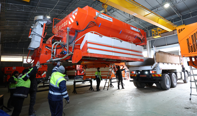 지난 17일 인천 서구 원창동 제설 장비 자재창고에서 인천시 종합건설본부 관계자들이 제설제 살포기를 덤프트럭에 설치하고 있다.