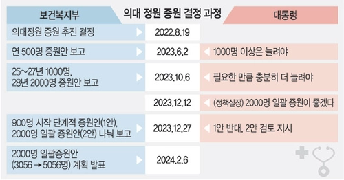 증원 시점에 대해서도 복지부와 대통령실 사이 논의가 미흡했던 것으로 나타났다. 조 전 장관은 의료계의 반발을 우려해 네 자릿수 증원이 아닌 900명 증원으로 시작하는 1안과 2000명을 일괄 증원하는 2안을 대통령실에 보고했다. 이에 윤 전 대통령이 1안에 대한 거부를 명확히 하면서 2000명 일괄 증원안으로 가닥을 잡게 됐다는 것이 감사원 설명이다. 다만 이 과정에서도 명확히 2000명을 증원하라는 명령을 하지 않은 채 진행돼, 결국 조 전 장관이 2월 의대증원 발표를 하게 된 것으로 나타났다.