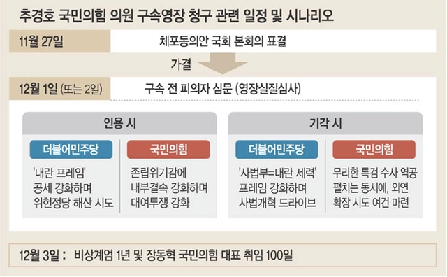 반대로 영장이 기각되면 국민의힘은 특검 수사와 민주당의 공격에 맞서 운신의 폭이 넓어지는 결과를 얻을 수 있다. 계엄 1년, 추 의원 구속영장 기각을 계기로 노선을 전환할 수 있다는 전망이 나온다. 계엄 1년이 되는 날이 장 대표 취임 100일인 점도 강성 기조를 유지할지, 중도 확장 길로 나설지를 가를 분기점이 될 수 있는 이유로 꼽힌다.