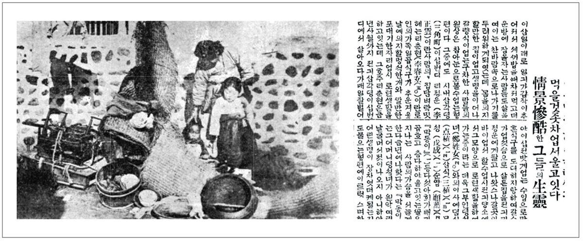 가난한 사람이 살기에는 여름보다는 겨울이 훨씬 힘든 법이다. 100년 전 겨울도 역시 마찬가지일 텐데 1925년 12월 1일 동아일보에 보기에도 딱한 한 장의 사진이 눈에 띈다. 솥과 집기는 길가에 널브러져 있고 가마니 속에는 작은 아이의 모습이 보인다. 무슨 사연이 있어 길가에 이런 모습으로 있었을까.