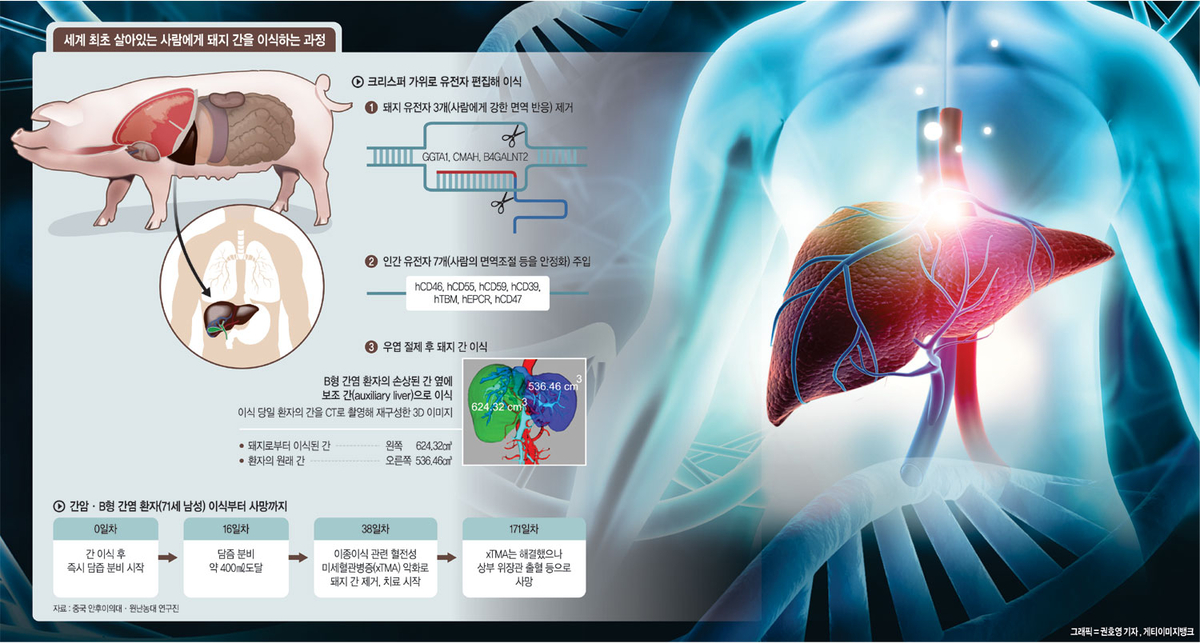 ◇살아있는 인간에게 돼지 간 이식=지난달 유럽간학회가 발간하는 ‘간장학 저널’에 따르면 중국 안후이의대와 윈난농대 공동연구팀은 71세 남성 간암 환자에게 유전자 편집 돼지의 간을 이식해 38일 동안 기능을 유지시키는 데 성공했다. 환자는 B형 간염으로 인한 간경변증과 15㎝ 크기의 거대 간세포암을 앓고 있었다. 종양이 우측 간의 상당 부분을 뒤덮고 있었지만 이를 절제하면 좌엽이 510㎤밖에 남지 않아 간부전 가능성이 매우 컸다.