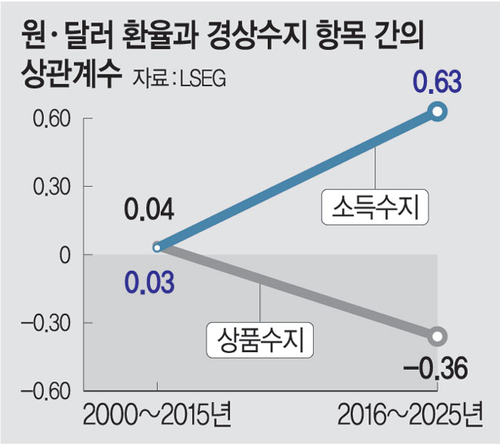 3일 글로벌 금융 데이터 분석 기관 런던증권거래소그룹(LSEG) 등이 한국은행의 경상수지 통계를 바탕으로 분석한 바에 따르면 지난 2000년부터 2015년까지 경상수지에서 대부분을 차지했던 상품수지와 환율의 상관계수는 0.04였으나 2016년부터 2025년까지는 -0.36%으로 음의 상관관계를 보였다. 반면 소득수지는 2000년부터 2015년까지는 환율과 0.03의 상관계수를 보였으나 2016년 이후 계수는 0.63로 나타났다. 이는 상품수지와 환율과의 연관성은 줄어들고 소득수지와 연관성은 더 커졌음을 의미한다. 상품수지 연관성이 컸던 과거엔 통상 원화가 약세이면 수출 경쟁력이 높아지고 이에 따라 높아진 수출로 상품수지 흑자가 커지면 달러가 들어와 다시 환율이 제자리를 찾아가던 흐름이 있었다. 그러나 해외 투자가 국내 투자액보다 더 컸던 최근 10년 간 소득수지가 커지면 환율이 올라가는 흐름이 뚜렷해진 것이다.