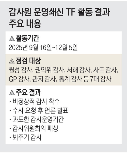 감사원은 이번 TF 조사 결과에 따라 특조국을 폐지하겠다고 밝혔다. 김 권한대행은 “특조국은 전횡적 감사를 가능하게 하는 가장 유용한 수단”이라고 했다. 또 강압감사 재발을 방지하기 위해 ‘감사원 공무원 행동강령’ 등 규정을 개정하고, 감사위원회의 통제를 강화하기로 했다. 이에 따라 민감한 사안이나 연간계획에 없던 감사사항을 추가 착수할 경우 외부 전문가 참여 등을 통한 ‘감사개시 자문위원회’(가칭)의 자문을 거쳐 감사위에서 착수 여부를 결정한다.