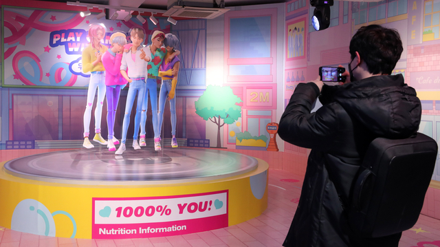 3일 서울 성동구에서 열린 ‘케이팝 데몬 헌터스 팝업’ 미디어 라운딩 행사에 한 관람객이 ‘사자보이즈’ 홀로그램의 사진을 찍고 있다.