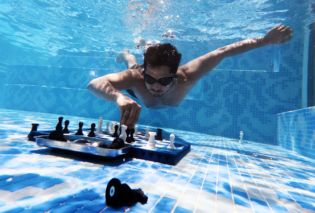 4일 남아프리카공화국 케이프타운의 한 호텔에서 진행된 ‘다이빙 체스대회’에 참가한 인도 체스 선수 비디트 구즈라티가 수영장 물속에서 체스를 두고 있다.