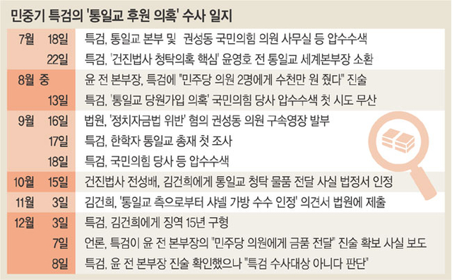 국민의힘은 2022년 대선 전후로 민주당 유력 정치인에게 금품을 지원했다는 윤영호 전 통일교 세계본부장 ‘입’에도 촉각을 곤두세우고 있다. 윤 전 본부장은 업무상 횡령 등 혐의 관련 본인 재판에서 “현 정부의 장관급 네 분에게 어프로치했고, 이 중 두 분은 (한학자) 총재에게도 왔다 갔다”고 증언했다. 윤 전 본부장은 특검에서도 이 같은 취지의 진술을 했고, 이와 함께 민주당 관계자 15명에게 금전적 지원을 했다는 진술을 한 것으로 알려졌다. 국민의힘은 윤 전 본부장의 진술 등에 비춰, 특검의 ‘선택적 수사’ 뒷배로 대통령실 개입을 강하게 의심하고 있다.