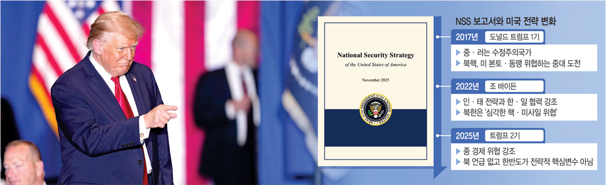 NSS의 전략 기조: 2017년 트럼프 1기 때에는 중·러를 수정주의국가로 규정하고 북핵을 미 본토·동맹을 위협하는 중대 도전으로 명시. 2022년 바이든 때엔 인·태 전략과 한·일 협력, 북한의 심각한 핵·미사일 위협을 강조.
