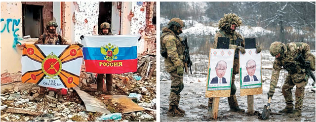 러시아 군인들이 11일 러시아군이 완전 점령했다고 주장한 우크라이나 동부 도네츠크의 소도시 시베르스크에서 국기와 부대 깃발을 펼쳐 보이고 있다(왼쪽 사진). 오른쪽 사진은 10일 우크라이나 하르키우에서 우크라이나 군인들이 블라디미르 푸틴 러시아 대통령의 얼굴이 그려진 사격 표적판을 고정시키고 있는 모습.