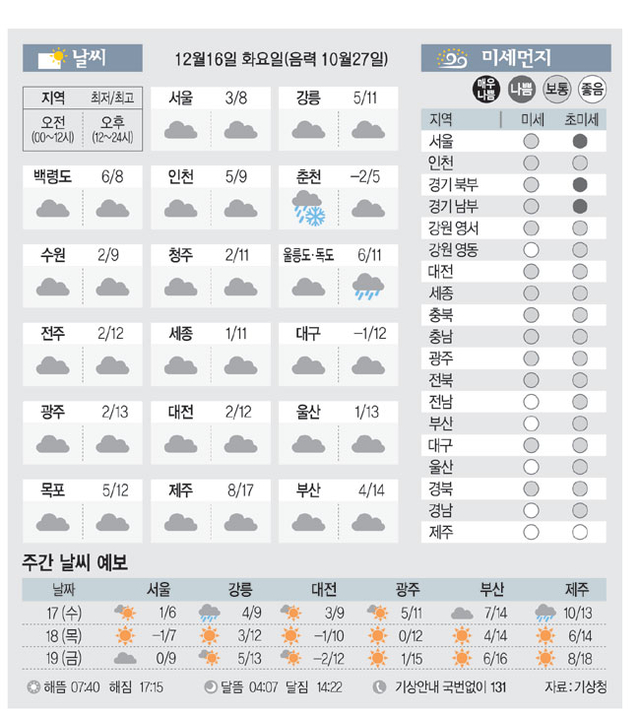 [날씨이야기]12월16일 화요일(음력 10월27일)