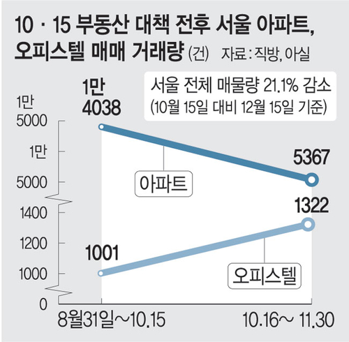 15일 부동산 플랫폼 직방이 국토교통부 실거래가 자료를 분석한 결과에 따르면, 서울 아파트 매매 거래량은 10·15 대책 시행 이전 46일(8월 31일∼10월 15일) 1만4038건에서 이후 46일(10월 16일∼11월 30일) 5367건으로 약 62% 감소했다. 반면 오피스텔은 같은 기간 1001건에서 1322건으로 32% 증가했다.