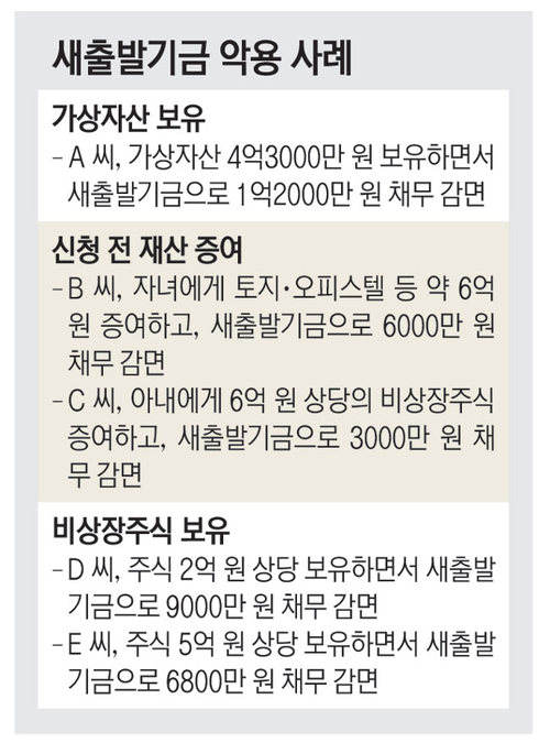 또 새출발기금 채무감면액이 자산 등 규모에 따라 결정되는 것을 악용해 자산에 포함되지 않는 가상자산 또는 비상장주식 보유 사실을 숨기거나 감면 신청 직전 자신의 재산을 가족에게 증여하는 등의 사해행위 실태도 이번 감사에서 적발됐다. 지난해 말 기준 가상자산을 1000만 원 이상 보유한 새출발기금 이용자는 269명으로 이들의 원금 감면액은 총 225억 원이었다. 1000만 원 이상 증여한 경우는 77명으로 66억 원을 감면받았고, 1000만 원 이상 비상장주식 보유자는 39명으로 총 34억 원을 감면받은 것으로 나타났다.