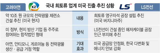 고려아연이 미국에 전략광물을 추출·정제할 수 있는 수조 원 규모의 제련소를 건설하는 방안을 추진한다. 미 정부와 방산기업이 고려아연과 함께 3조 원 규모의 합작법인(JV)을 만들고 최소 1조 원가량을 직접투자하는 방식으로, 글로벌 공급망을 장악하고 있는 중국의 ‘자원 무기화’에 맞서 ‘한·미 전략자원 동맹’을 구축하기 위한 행보로 분석된다.