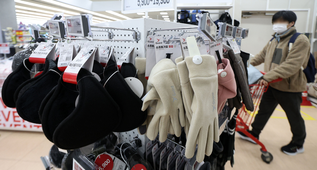 영하권 추위가 이어지는 등 본격적인 겨울철로 접어든 가운데 14일 서울의 한 대형 유통 매장에 귀마개·장갑 등 각종 방한용품이 진열돼 있다.