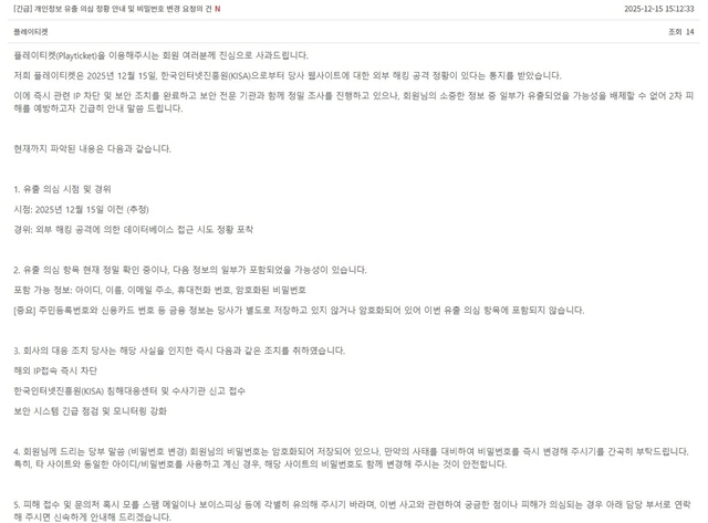 플레이티켓은 15일 대표이사 명의의 공지문을 통해 한국인터넷진흥원으로부터 웹사이트에 대한 외부 해킹 공격 정황이 있다는 통지를 받고 관련 IP 차단 및 보안 조치를 완료했다고 밝혔다. 이와 함께 보안 전문 기관과 함께 정밀 조사를 진행하고 있다고 덧붙였다.