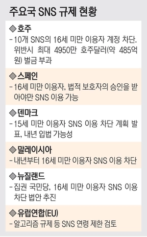 뉴욕타임스(NYT)에 따르면 덴마크는 지난달 15세 미만 아동·청소년의 SNS 플랫폼 이용 금지 계획을 발표했다. 정부는 시행 시기를 밝히지 않았는데 호주의 사례를 지켜본 뒤 내년 법 제정에 나설 것이란 관측이 나온다. 말레이시아도 내년부터 16세 미만 아동의 SNS 사용을 금지하겠다는 방침을 밝히고 SNS에 사용자 연령 확인을 강제하는 방안을 검토 중이다. 이 밖에 노르웨이, 싱가포르, 인도네시아 등도 비슷한 조치 도입에 관심을 두고 있다.