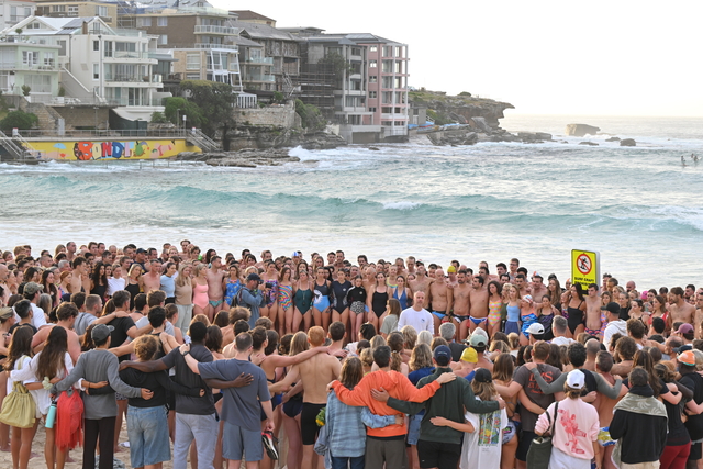 총격 사건이 발생했던 호주 시드니 본다이 비치에서 17일 오전 수영·서핑 클럽 회원들과 시민들이 추모 행사를 갖고 있다. 지난 14일 오후 유대교 명절인 하누카 축제 중 벌어진 무슬림 부자의 총격으로 15명이 희생됐다.