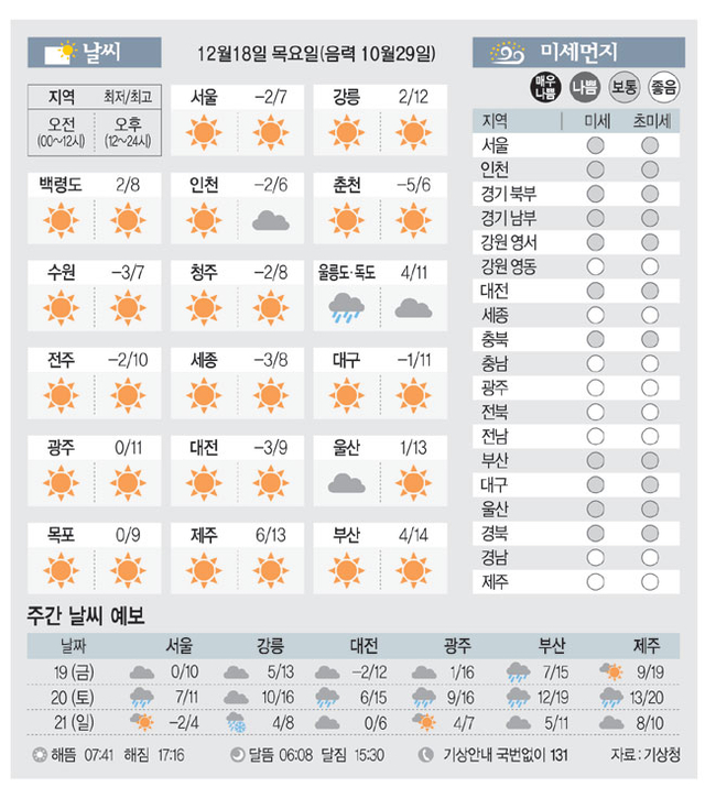 [날씨이야기]12월18일 목요일(음력 10월29일)