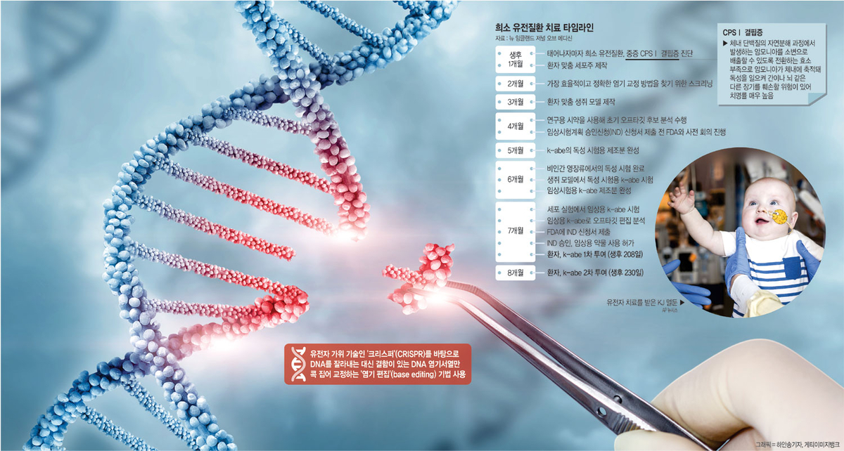 ◇DNA 염기 30억 개 중 하나를 교정=기존의 유전자 편집 치료법은 다수의 사람을 치료하기 위해 설계됐지만, KJ의 치료는 개인 맞춤형으로 진행됐다는 것이 차이점이었다. 의료진은 크리스퍼 유전자 가위를 이용한 염기 편집으로 문제가 되는 돌연변이, 즉 인간 게놈에 있는 30억 개의 DNA 염기 중 하나의 결함이 있는 염기를 표적으로 삼아 교정하기로 했다.