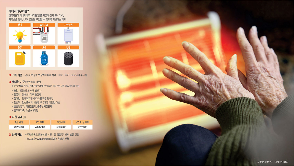 에너지바우처는 생계·의료·주거·교육급여 수급자에 한해 전기, 도시가스, 지역난방, 등유, LPG, 연탄 등을 사용하거나 구입할 때 연 최대 70만1300원(4인 이상 세대 기준)을 재정으로 지원하는 제도다. 이재명 대통령은 지난 20일 SNS를 통해 “겨울이 깊어지면서 추위가 더 매섭게 다가온다”며 “더 어려운 국민에게 더 많은 온기가 전해지도록 정부의 책임 있는 역할이 필요하다”고 밝혔다. 그러면서 에너지바우처 지원금을 대폭 늘려 난방비 고통을 조금이라도 줄이라고 지시했다.