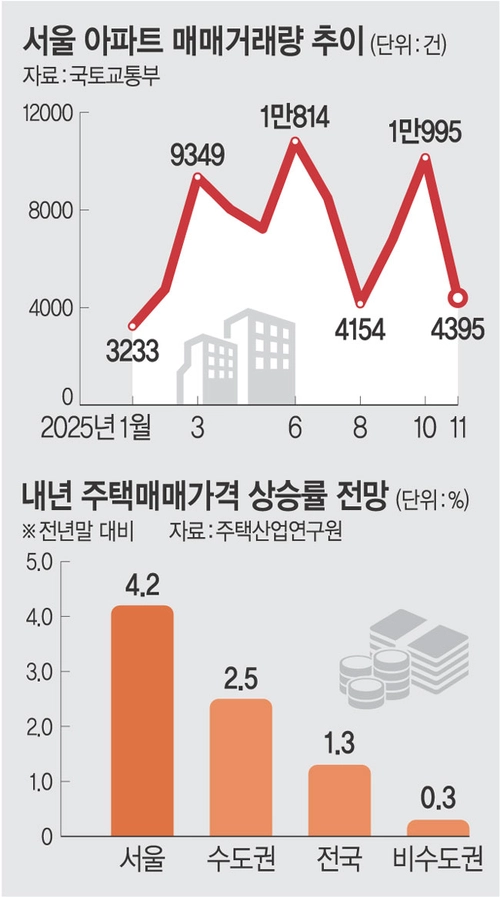 수도권 37곳을 ‘3중 규제’로 묶은 10·15 부동산 대책 이후 서울 주택 매매 거래량이 약 60% 급감했지만 내년 집값 상승세는 가파를 것으로 예상되고 있다. 내년 ‘입주절벽’이 예고된 상황에서 시중 유동성은 폭증해 집값을 밀어 올리고 있는 양상이다. 서울 아파트 매물은 연초보다 30% 줄면서 전월세 시장 불확실성도 갈수록 커지고 있다.
