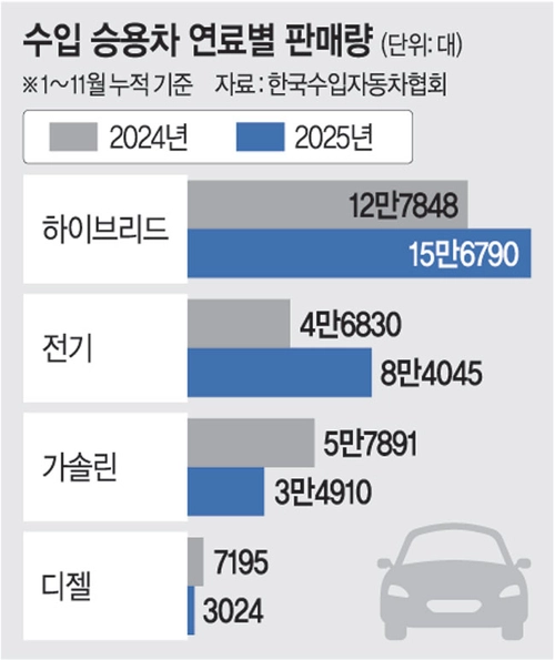 연료별 판매량을 보면 전기차는 가솔린(3만4910대)과 디젤(3024대) 차량을 큰 격차로 따돌렸다. 하이브리드차는 전년 동기(12만7848대)와 비교해 22.5% 늘어난 15만6790대가 팔렸는데, 증가율은 전기차가 앞섰다.