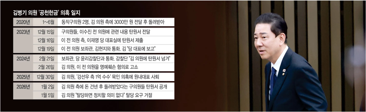 김병기 공천헌금 의혹 사건은 2020년 총선→2022년 지방선거→2024년 총선을 고리로 ‘셀프 검증·셀프 면죄’ 구조를 내보인다. 사건의 전말은 이렇다. 서울 동작구의원 2명이 2020년 총선 전 김 전 원내대표 측에 총 3000만 원을 전달한 후 총선 뒤 돌려받았고, 2023년 말 이재명 당시 당대표를 수신자로 하는 관련 내용을 담은 탄원서를 작성했다. 탄원서는 2024년 초 당대표실과 당 윤리감찰단을 거쳐 김병기에게 돌아왔다.