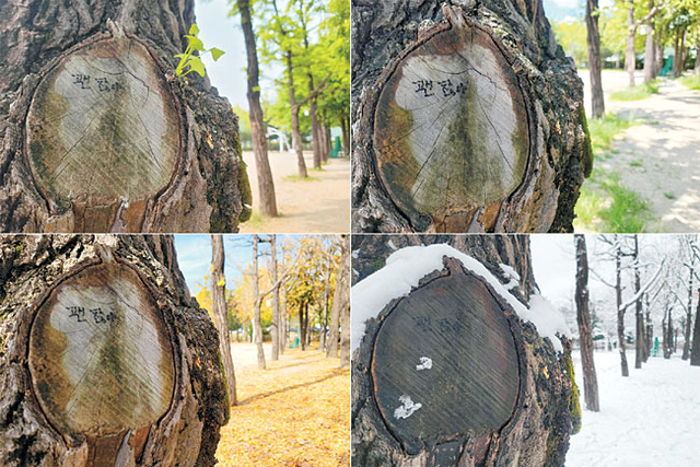 경희궁 공원 나무에 누군가 남긴 “괜찮아”라는 글씨가 있습니다. 2023년 봄부터 2025년 겨울까지 계절이 여러 번 바뀌는 동안, 글씨는 지워지지 않았습니다. 봄의 나무는 새싹을 틔웠고, 여름에는 울창하게 자라 그늘을 내주었습니다. 가을이 오자 잎들은 길 위에 쌓였고, 겨울에는 온몸으로 눈을 맞아냈습니다. 그 나무를 지나던 사람들은 잠시 멈춰 서서 마음속으로 같은 말을 떠올렸습니다. “괜찮아”.