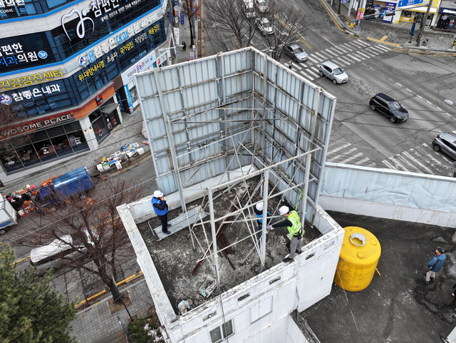 광주 북구 안전총괄과 관계자와 옥외광고협회원들이 지난 12일 광주 북구 풍향동의 한 건물 옥상에서 강풍에 대비해 간판들을 대상으로 안전점검을 실시하고 있다.