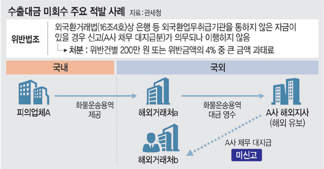 해외거래 미신고를 통한 수출대금 미회수가 대표적이다. 복합운송업체 A 사는 해외 거래처로부터 받은 운송대금을 국내로 들여오지 않고 해외지사 계좌에 유보한 뒤, 다른 해외 거래처에 지급할 채무가 생기면 이를 현지에서 외환당국에 미보고 상계 처리했다. 이종욱 관세청 차장은 “수출대금이 반드시 국내로 들어와야 하는 것은 아니지만 해외에서 상계 처리할 경우에도 반드시 사후보고를 해야 한다”고 말했다.